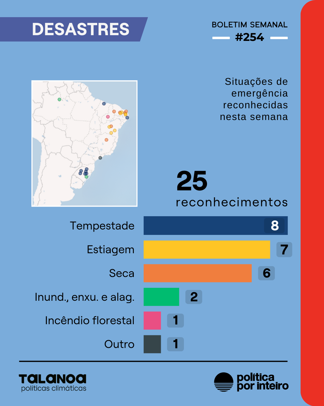 O Monitor de Desastres captou 7 atos de reconhecimento de emergência decorrentes de eventos climáticos extremos, que impactaram 25 municípios. Assim como na semana anterior, as tipologias Chuvas Intensas (Tempestade) e Estiagem praticamente “empataram”, com Seca vindo logo em seguida em número de atos. Enquanto no Rio Grande do Sul predominam as tempestades, no Nordeste se veem os dois extremos: de estiagem na Bahia e na Paraíba, a chuvas intensas no Maranhão e em Pernambuco.