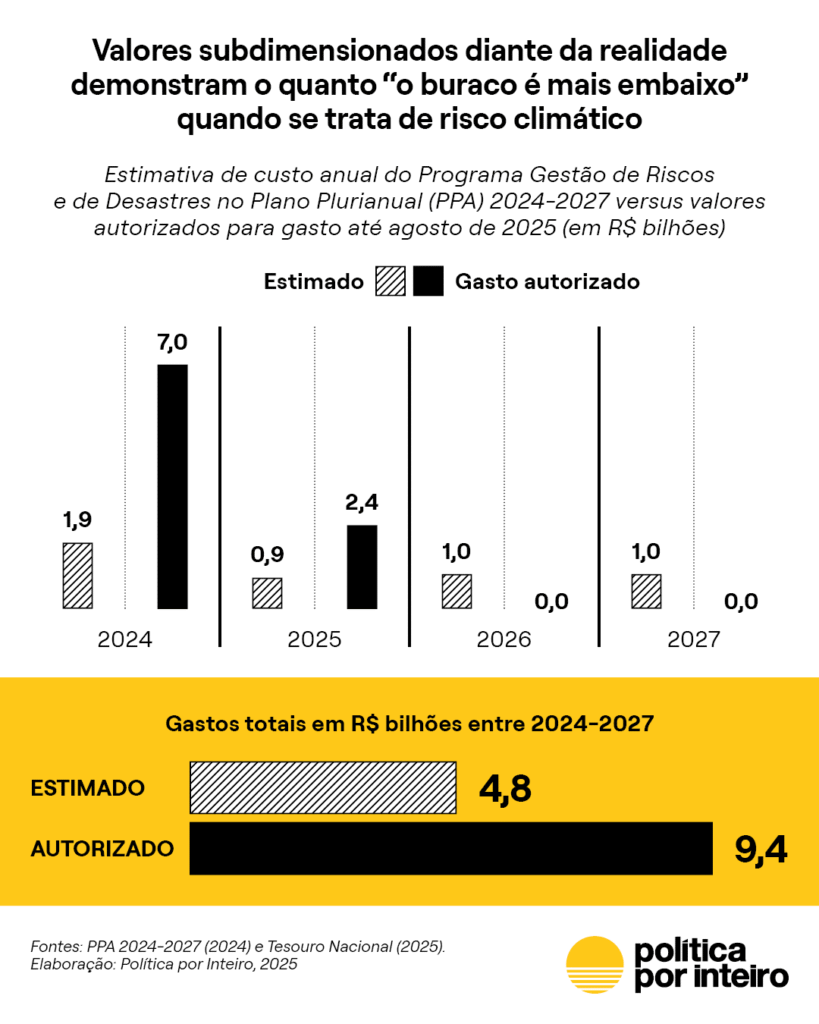 O Plano Plurianual (PPA) 2024-2027 do Brasil estimou que o país gastaria aproximadamente R$ 5 bilhões (aqui, à pág. 31) para os quatro anos de sua operação. Só em 2024, a conta já estourou: segundo o Tesouro Nacional, o gasto foi de R$ 6,9 bi. Em 2025, até agora, foram autorizados gastos de R$ 2,4 bilhões para gestão de riscos e desastres. Ou seja: vamos caminhando para ultrapassar, em autorizações de gasto, o dobro do valor planejado, antes de o 1º tempo do jogo do planejamento terminar.