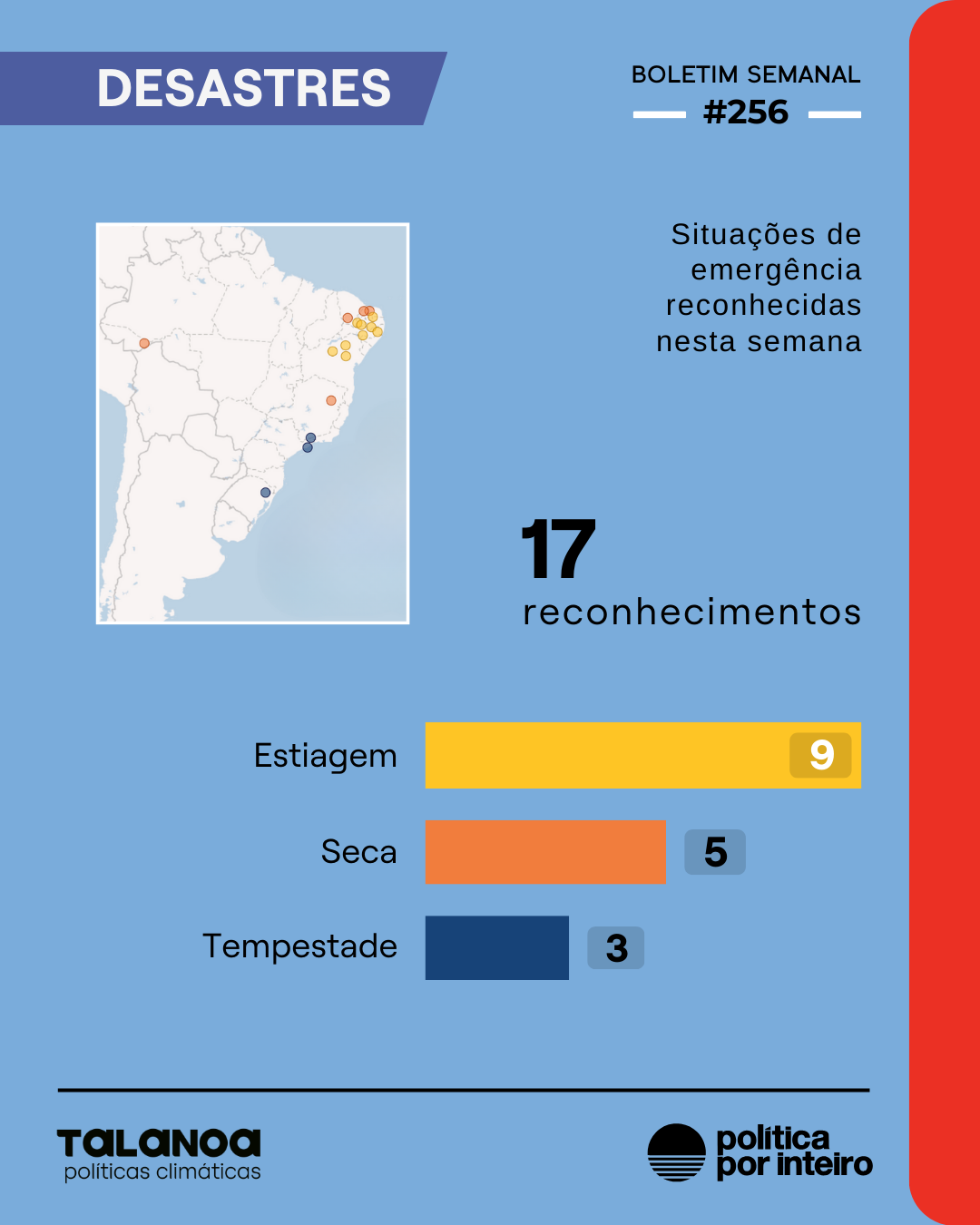 O Monitor de Desastres captou 6 atos de reconhecimento de emergência decorrentes de eventos climáticos extremos, que impactaram 17 municípios. O evento mais recorrente foi Estiagem, concentrada na Região Nordeste do país. A Seca foi registrada pontualmente na Região Norte e Nordeste e também no Sudeste. As Tempestades ocorreram no Sul e Sudeste.