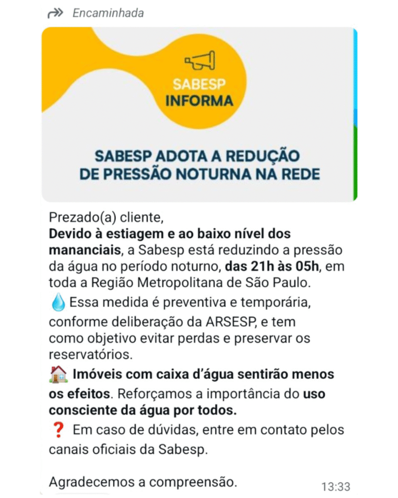 Nesta semana, a Sabesp anunciou redução da pressão da água no abastecimento da Grande São Paulo, durante a madrugada. Com menor pressão, a vazão de água é menor, estratégia para reduzir perdas no sistema e preservar os reservatórios. O comunicado à população deixou claro o motivo da medida, que seguiu determinação da Agência Reguladora de Serviços Públicos do Estado de São Paulo (Arsesp): “Devido à estiagem e ao baixo nível dos mananciais, a Sabesp está reduzindo a pressão da água no período noturno, das 21h às 05h, em toda a Região Metropolitana de São Paulo”. O nível de água dos sistemas que abastecem a Grande SP está no menor nível desde 2015, quando ocorreu a pior crise hídrica da região.