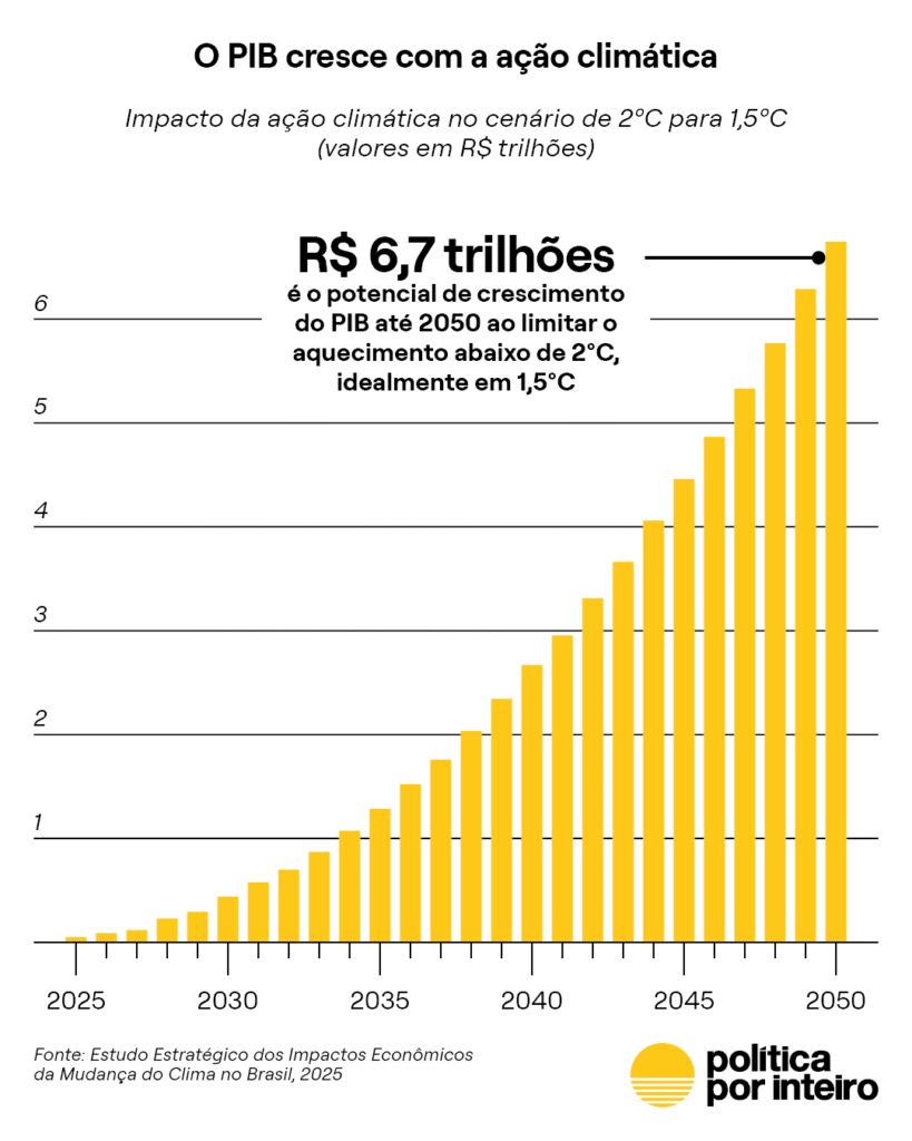 Estudo coordenado pelo Ministério do Planejamento e Orçamento (MPO) para subsidiar a Estratégia Nacional de Longo Prazo estima o impacto na economia de um aquecimento global acima de 1,5ºC em relação à era pré-industrial: uma perda entre 89% e 146% do Produto Interno Bruto (PIB) país em 25 anos. Os resultados da pesquisa mostram uma perda superior a R$ 17 trilhões para a economia e de 4,4 milhões de empregos até 2050, além de alta no preço dos alimentos, se o mundo não conseguir conter o aumento da temperatura dentro do objetivo estabelecido no Acordo de Paris.