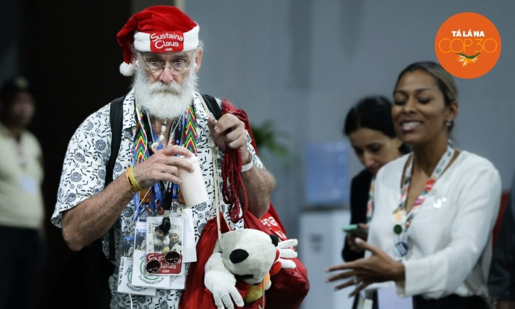 O que você pediria se encontrasse o Papai Noel na COP30? Philipp McMaster, ou “Sustaina Claus” , circula pelos corredores da Conferência em Belém. Ele é um ativista ambiental canadense que já esteve em várias COPs usando a figura lúdica de Papai Noel para atrair a atenção da mídia e dos participantes para o consumo exagerado e o aquecimento global. Uma de suas marcas é o gesto de três dedos, que simboliza o equilíbrio entre sociedade, meio ambiente e economia.