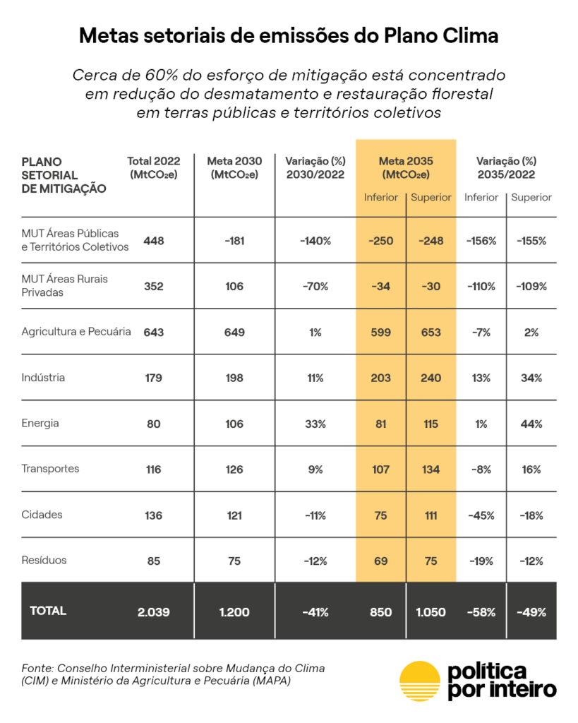 A maior parcela do esforço para reduzir emissões está concentrada no plano setorial de mudança do uso da terra relativo a áreas públicas e territórios coletivos – anteriormente, o setorial de conservação da natureza. Entre 2022 e 2035, a redução do desmatamento e a restauração florestal nesses territórios deverão ser capazes de cortar ou capturar cerca de 700 milhões de toneladas de CO2e, o que significa cerca de 60% da meta brasileira.