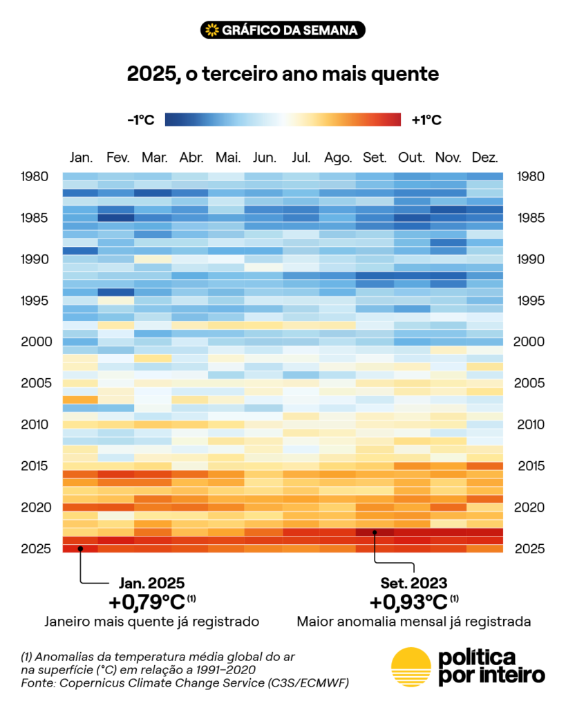 No Gráfico da Semana, mostramos as diferenças da temperatura média em relação à média histórica dos 30 anos anteriores a esta década. Essas variações são chamadas de anomalias. Quanto mais a cor do retângulo for próxima do branco, mais “normal” foi a temperatura daquele mês. Isto é, mais próximo da média de 1990 a 2020. Quanto mais azul, mais frio, sendo uma variação negativa (-X°C). Quanto mais vermelho, mais quente foi o mês. Assim, no mês mais quente registrado nos últimos 45 anos (1980 a 2025), setembro de 2023, a anomalia foi de +0,93°C. E, no ano passado, registrou-se o janeiro mais quente já observado pela humanidade, com a temperatura +0,79°C acima da média de 1990 a 2020.