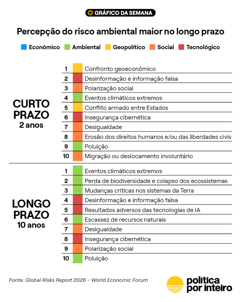 O relatório Riscos Globais 2026, do Fórum Econômico Mundial, apontou uma redução na percepção de riscos ambientais no curto prazo com o aumento das preocupações em torno das tensões geopolíticas. O ranking abaixo foi elaborado a partir de entrevistas com 1.300 atores relevantes, líderes globais, empresários, especialistas acadêmicos e membros de organizações internacionais e da sociedade civil. Eles foram consultados para estimar o impacto provável (severidade) de uma lista de 33 riscos no horizonte de dois e de dez anos.