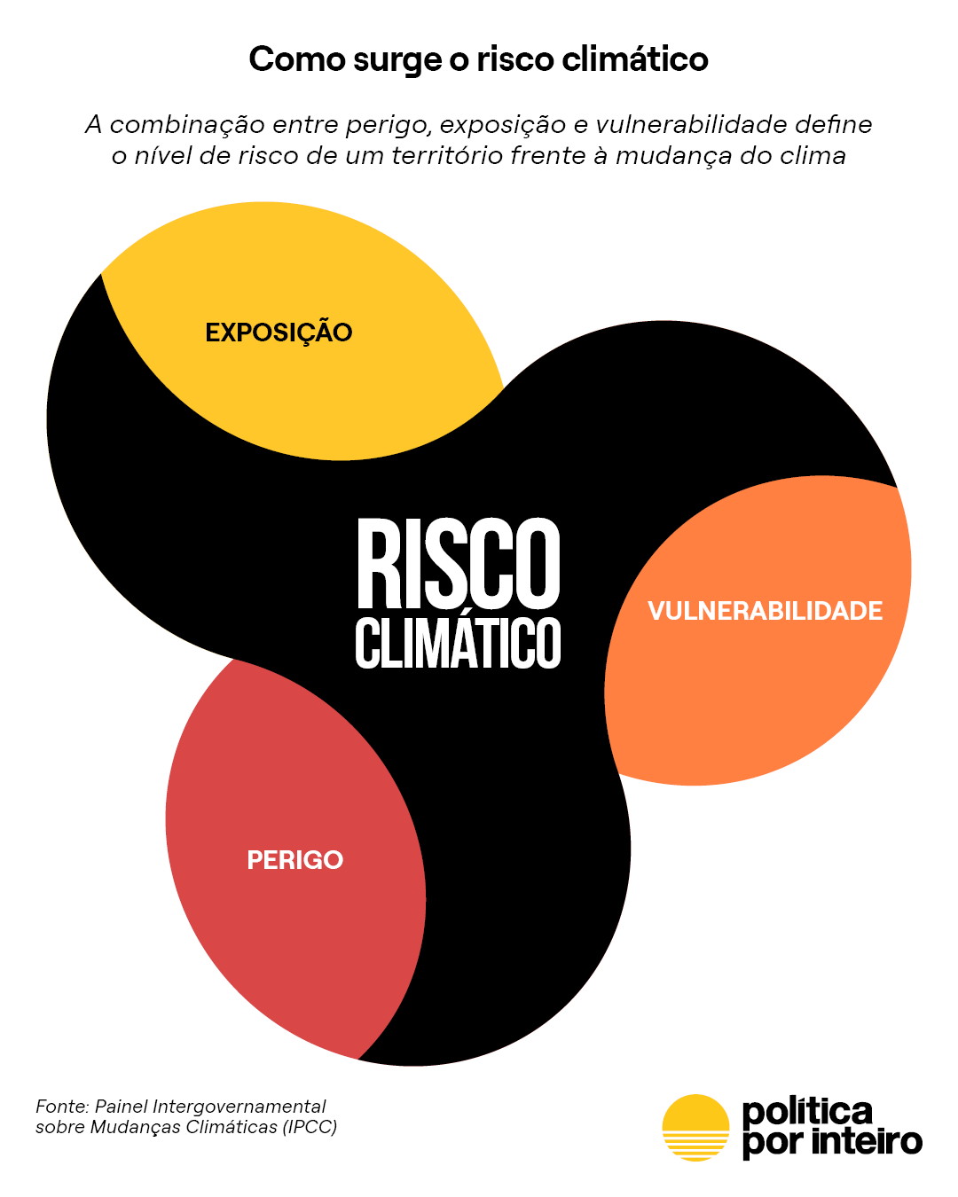 Risco Climático – De acordo com o Painel Intergovernamental sobre Mudanças Climáticas (IPCC), risco climático é definido como o resultado da interseção entre perigo, exposição e vulnerabilidade de determinado território aos efeitos das mudanças climáticas, sejam eles eventos extremos ou de longa duração. Novas abordagens incluem também a capacidade de resposta/adaptação como fator complementar determinante ao risco. O risco climático pode ser avaliado de acordo com diversas dimensões, como sociais, ambientais e econômicas.