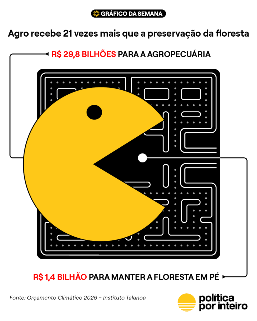 O dinheiro público federal liberado para programas que financiam a agropecuária é 21 vezes maior do que o que vai para a conservação da floresta no Orçamento da União. É o que mostra o estudo Orçamento Climático 2026, do Instituto Talanoa. Anualmente, as despesas do Governo Federal que mais contribuem tanto para a mitigação das emissões de gases de efeito estufa quanto para a adaptação às mudanças climáticas são analisadas.