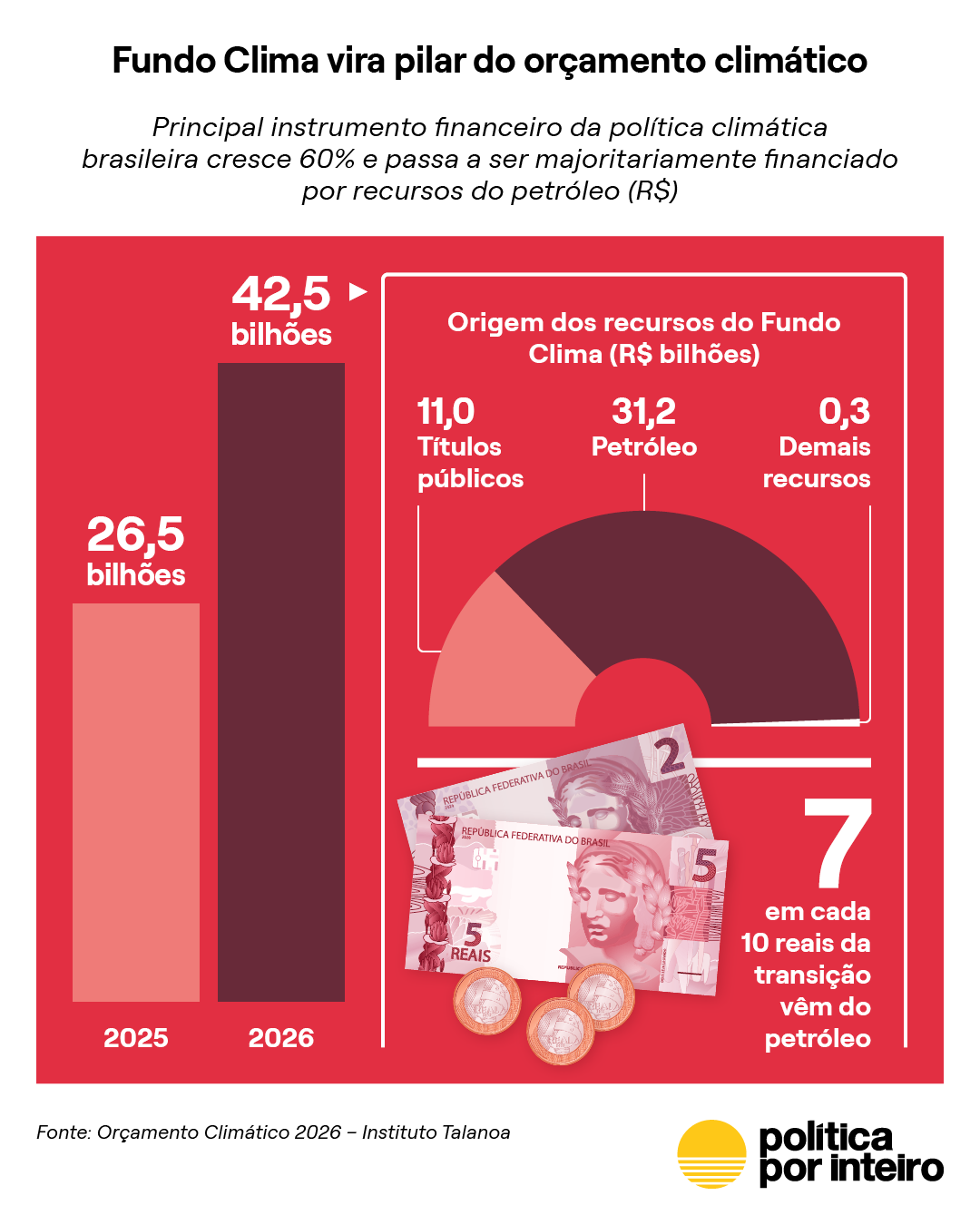 Em relação ao Fundo Clima, uma novidade neste ano é que 73% (R$ 31,2 bilhões) dos recursos disponíveis são oriundos do petróleo, por meio do Fundo Social do petróleo. Pela primeira vez, superam os recursos obtidos por meio da captação externa com títulos verdes lançados pelo Tesouro Nacional (26%, R$ 11 bilhões). Esse apontamento é importante em um momento em que discutimos o mapa do caminho para o Brasil se afastar dos combustíveis fósseis.