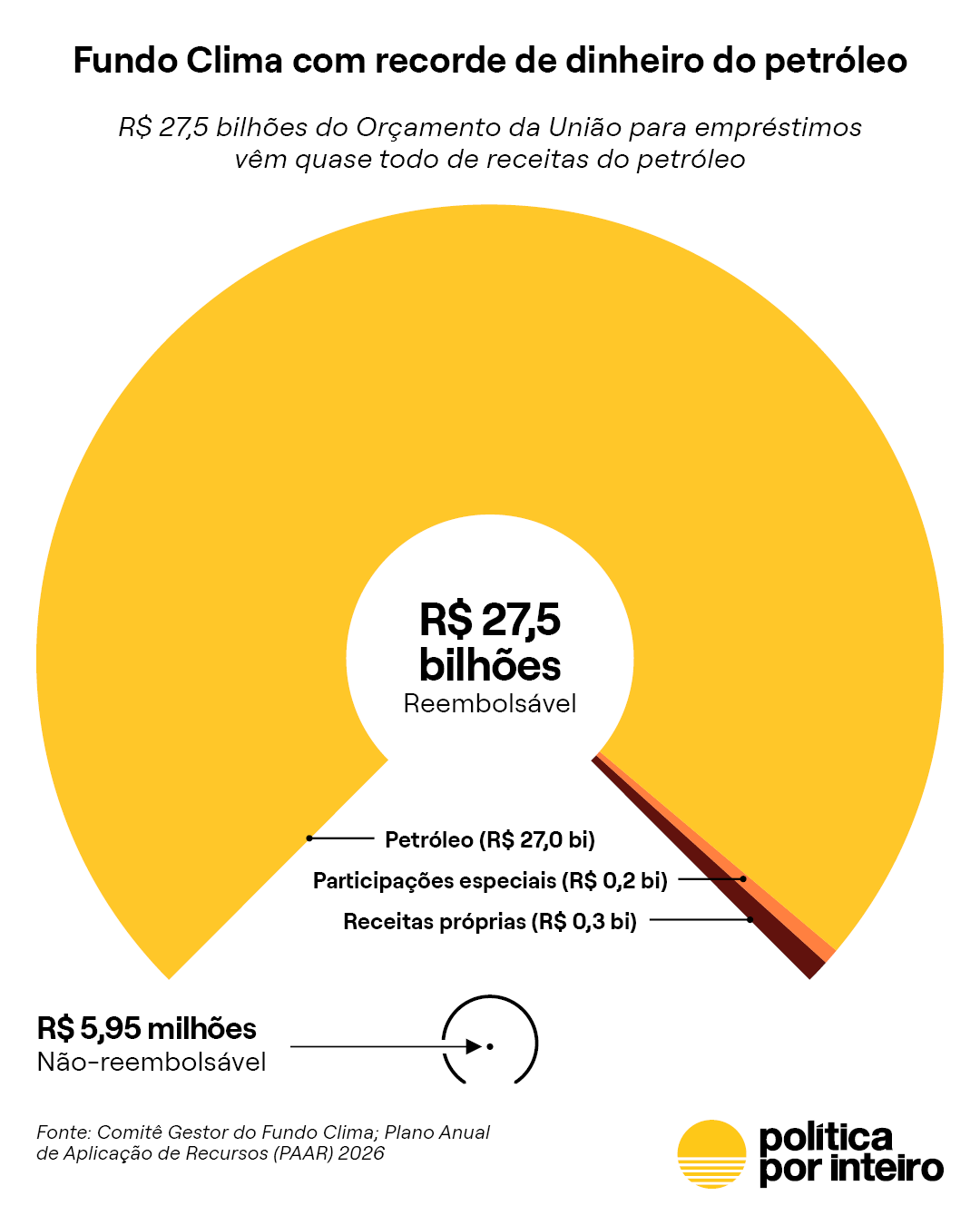 Com a aprovação do Plano Anual de Aplicação de Recursos (PAAR) pelo Comitê Gestor do Fundo Clima em 12 de março, o Banco Nacional de Desenvolvimento Econômico e Social (BNDES) poderá contar com o repasse de recordes R$ 27,5 bilhões do Orçamento da União para empréstimos do Fundo Clima em 2026. O principal mecanismo de financiamento climático do país vai funcionar quase integralmente com recursos vindos do petróleo, algo inédito no histórico recente do Fundo Clima, como inédito é o alto volume de dinheiro que movimenta neste ano.