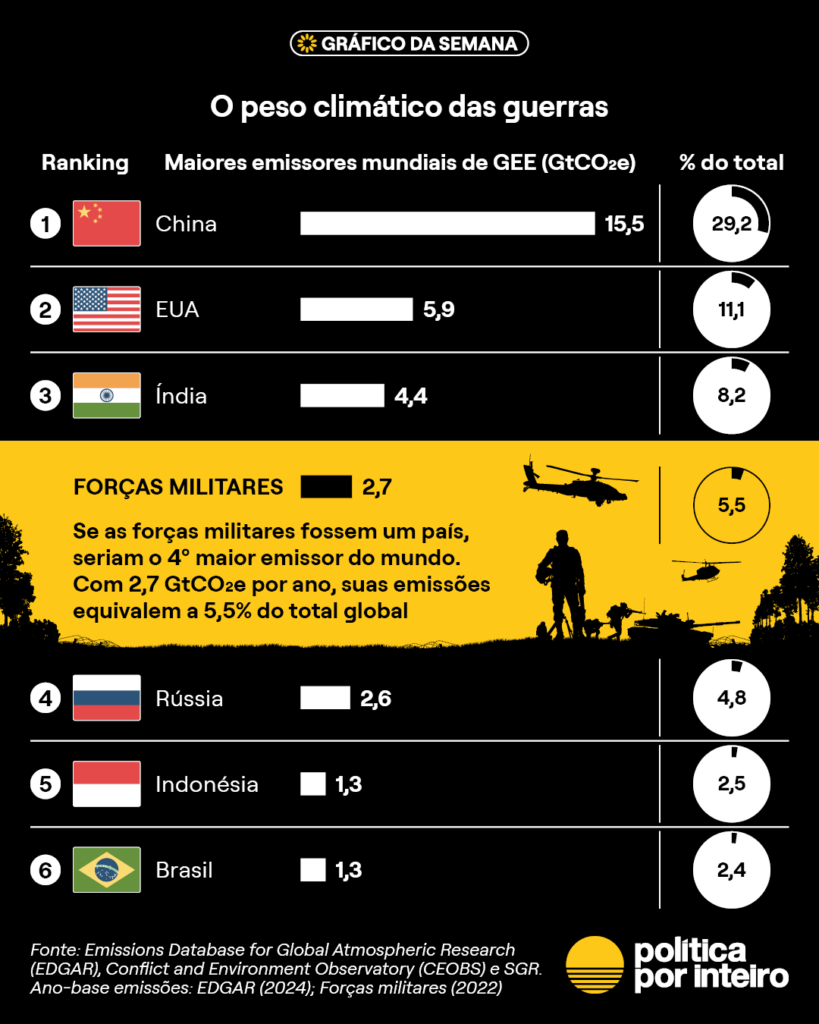 Do ponto de vista humanitário, as guerras são uma calamidade visível. Do ponto de vista climático, há mais argumentos para cessá-los: do financiamento, reduzido com a escalada de recursos que passam a ser destinados a fins militares, às emissões de gases de efeito estufa nos confrontos. O Gráfico da Semana mostra que, se as forças militares fossem um país, suas emissões as colocariam entre as nações mais emissoras do planeta.