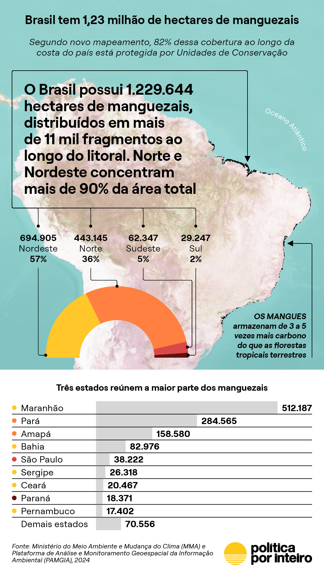 1,2 milhão de hectares. Essa é a extensão da faixa de manguezais em território nacional, dado apresentado durante a atualização de mapeamento do Programa Nacional de Conservação e Uso Sustentável dos Manguezais do Brasil (Pró-Manguezal), do Ministério do Meio Ambiente e Mudança do Clima. Os manguezais são um ecossistema fundamental para a captura de carbono. Dados recentes e surpreendentes confirmam que sua capacidade de armazenamento é de três a cinco vezes maior que a da floresta amazônica.