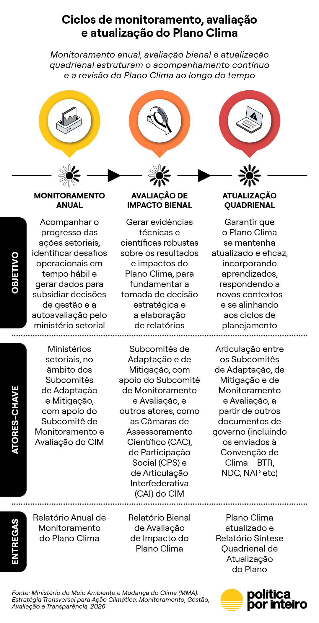 Em maio, iniciam-se as coletas para a construção da linha de base do monitoramento. Ao fim do ano, deve ser entregue o primeiro Relatório de Monitoramento Anual do Plano Clima pelo CIM. Há cronogramas anuais traçados até 2035, quando termina a vigência do atual documento, e um desenho do que seria a continuidade dos ciclos anuais, bienais e quadrienais para o próximo Plano Clima.