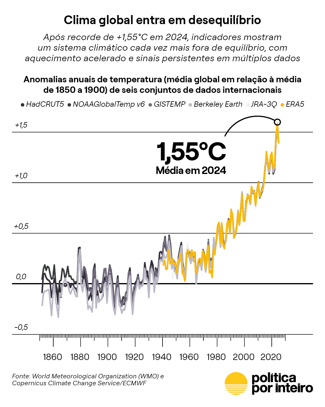 Relatório da Organização Meteorológica Mundial (OMM) confirmou a tendência observada nos últimos anos. Tivemos a década, aliás os 11 anos, de 2015 a 2025, mais quentes já registrados pela humanidade. O clima da humanidade nunca esteve tão fora do padrão. “Quando a história se repete 11 vezes, não é mais uma coincidência. É um chamado à ação”, afirma António Guterres, secretário-geral da ONU.