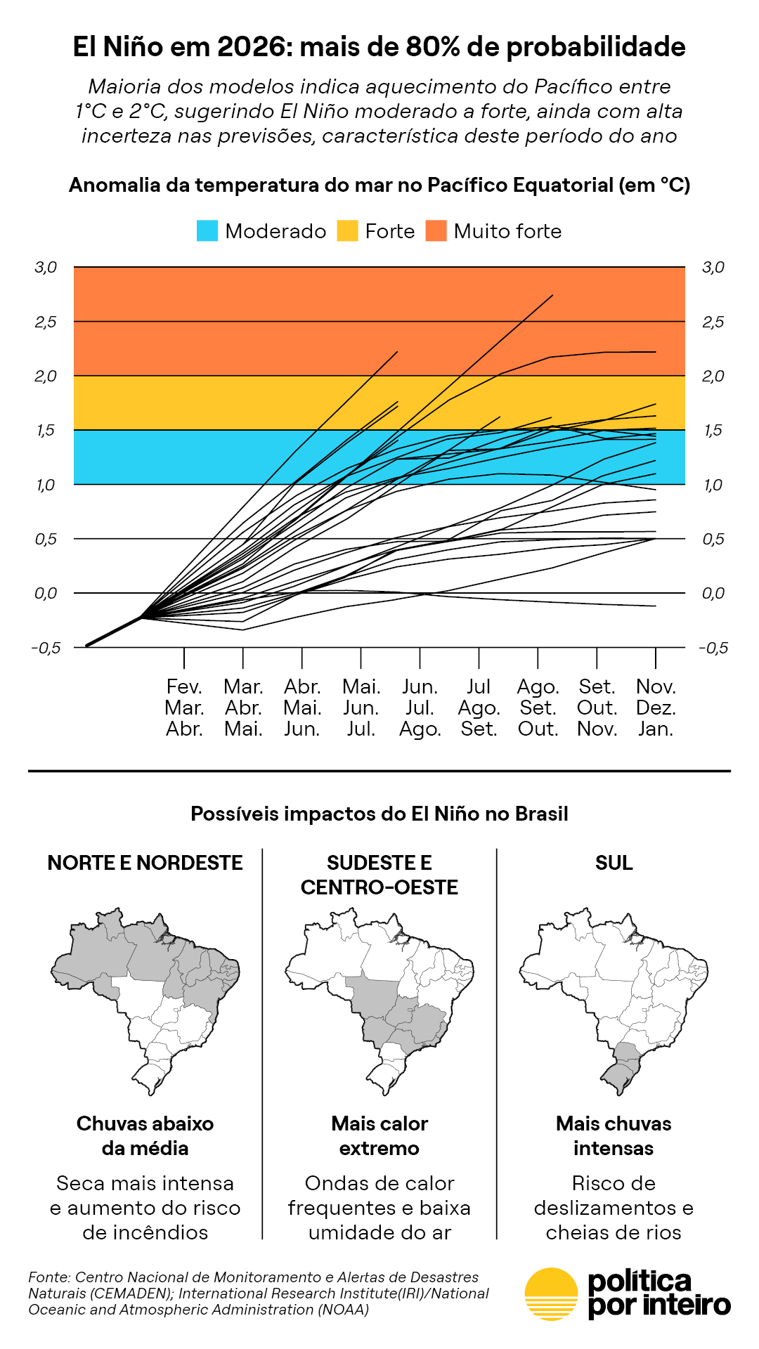 Segundo a nota, a probabilidade de que o fenômeno caracterizado pelo aquecimento das águas do Pacífico equatorial ocorra é, no momento, de mais de 80%. Porém, ainda não existem previsões confiáveis sobre a sua intensidade. É possível que seja um El Niño de moderado a forte, não atingindo o que se classifica como muito forte. Isto é, o aquecimento das águas não deve ultrapassar os 2°C em média (Entenda a escala de intensidade do El Niño no gráfico abaixo).