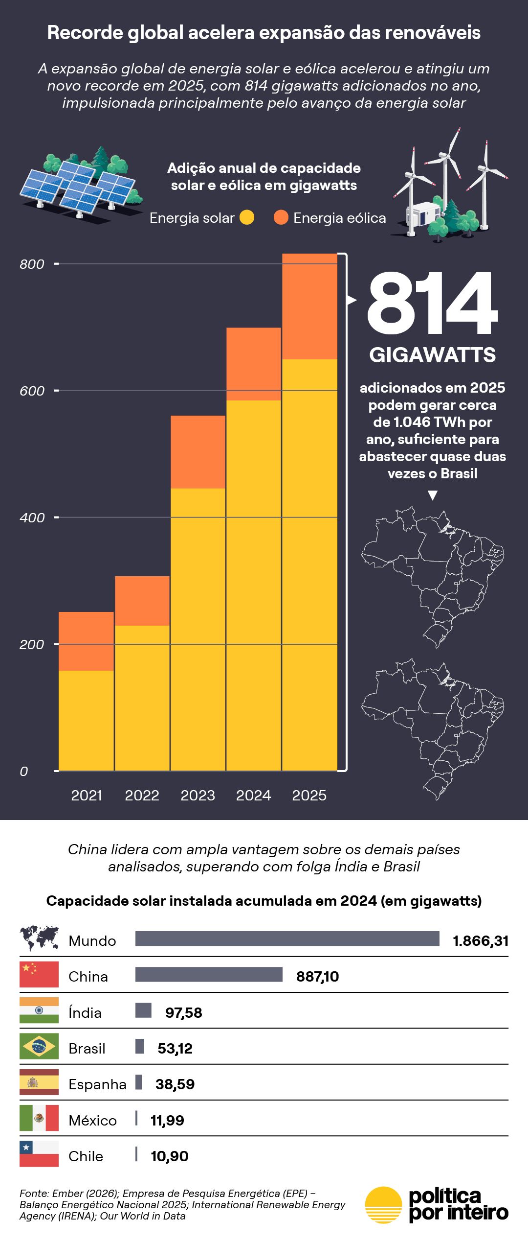 Dados recentes da Ember indicam que 2025 marcou um outro recorde na expansão de energias renováveis, com a instalação de 814 GW de capacidade solar e eólica, um aumento de 17% em relação a 2024. Com isso, a capacidade global combinada dessas fontes ultrapassou 4 TW, consolidando-as como as tecnologias de geração elétrica que mais crescem no mundo.