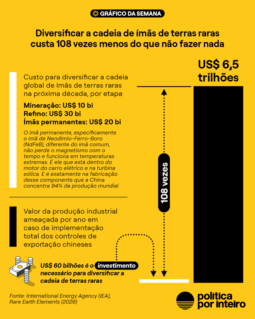 Quase a totalidade da fabricação de ímãs permanentes é realizada pela China. Esse é um dos produtos da cadeia de minerais críticos. São fabricados a partir de um grupo de elementos chamado de terras raras (leia mais no Tá Lá no Gráfico desta semana). Esse tipo de ímã não perde o magnetismo com o tempo e funciona em temperaturas extremamente altas. São componentes essenciais em produtos e equipamentos com papel importante na transição energética. Por exemplo, são usados no motor de carros elétricos ou em turbinas eólicas.