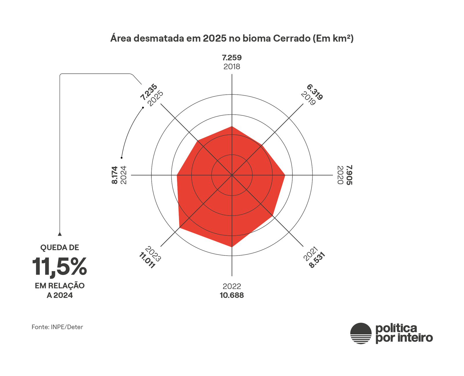 No Cerrado, a área desmatada foi maior do que na Amazônia: 7.235 km2, extensão essa concentrada no Matopiba, a fronteira agrícola que se expande nos estados do Maranhão, Tocantins, Piauí e Bahia. Foi o segundo ano de queda no desmatamento no bioma depois de uma sequência de altas.