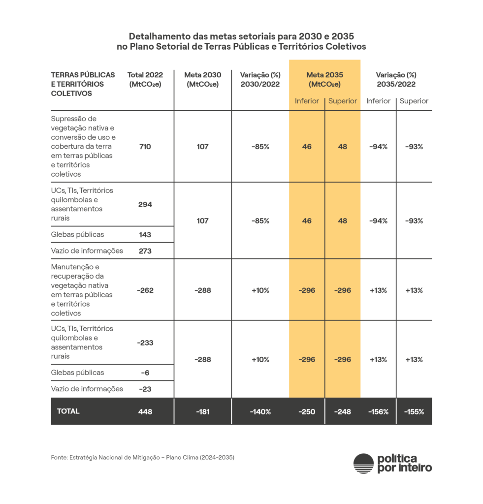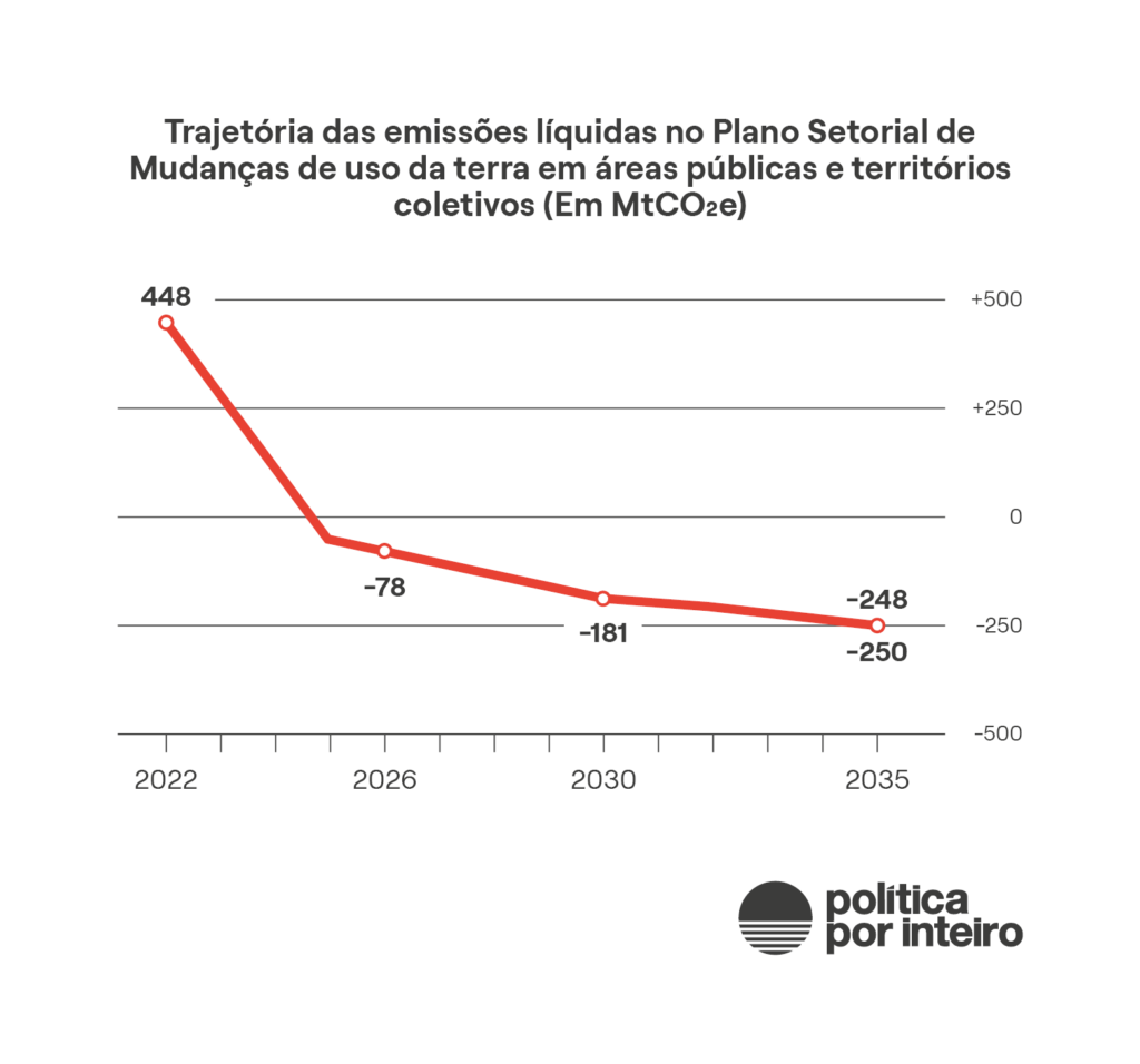 O plano setorial de mudanças de uso da terra em áreas públicas e territórios coletivos projeta uma curva acentuada já em 2025, ainda a ser confirmada. Depois das pressões do setor agropecuário, o combate ao desmatamento nos imóveis rurais reduziu sua participação na queda de emissões de gases de efeito estufa para 386 milhões de toneladas de carbono na meta mais ambiciosa. A versão final do Plano Clima registra uma emissão remanescente por desmatamento nesses imóveis entre 201 e 205 milhões de toneladas de carbono equivalente em 2035.