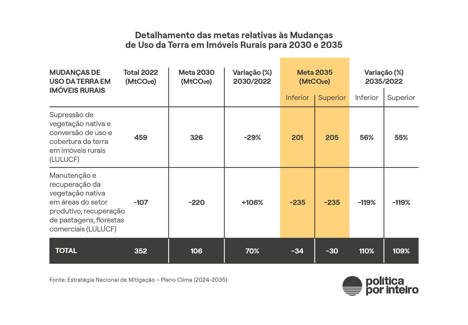 No conjunto de projeções do Plano Clima, como foi mencionado mais acima, a maior contribuição na redução das emissões cabe ao setor do uso da terra. A análise das tabelas do Plano Clima informa que a redução do desmatamento e a restauração florestal arcarão com a redução e a captura de até 1.084 gigatoneladas de dióxido de carbono equivalente na meta mais ambiciosa para 2035.