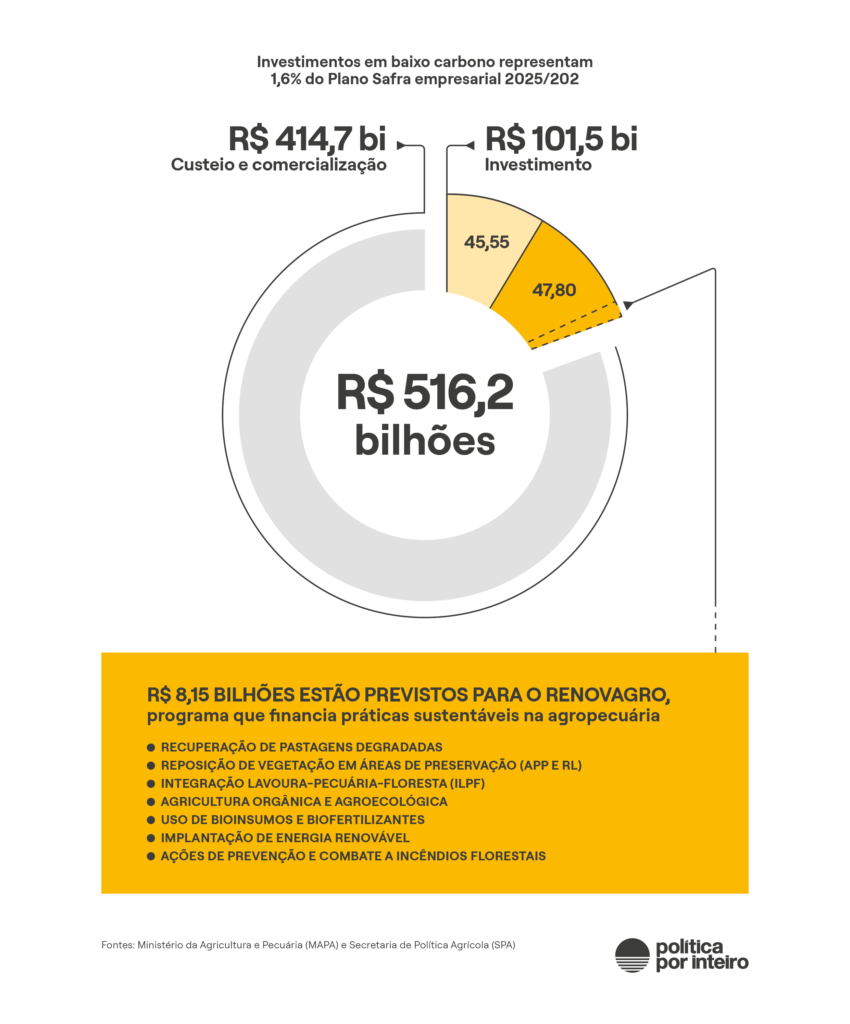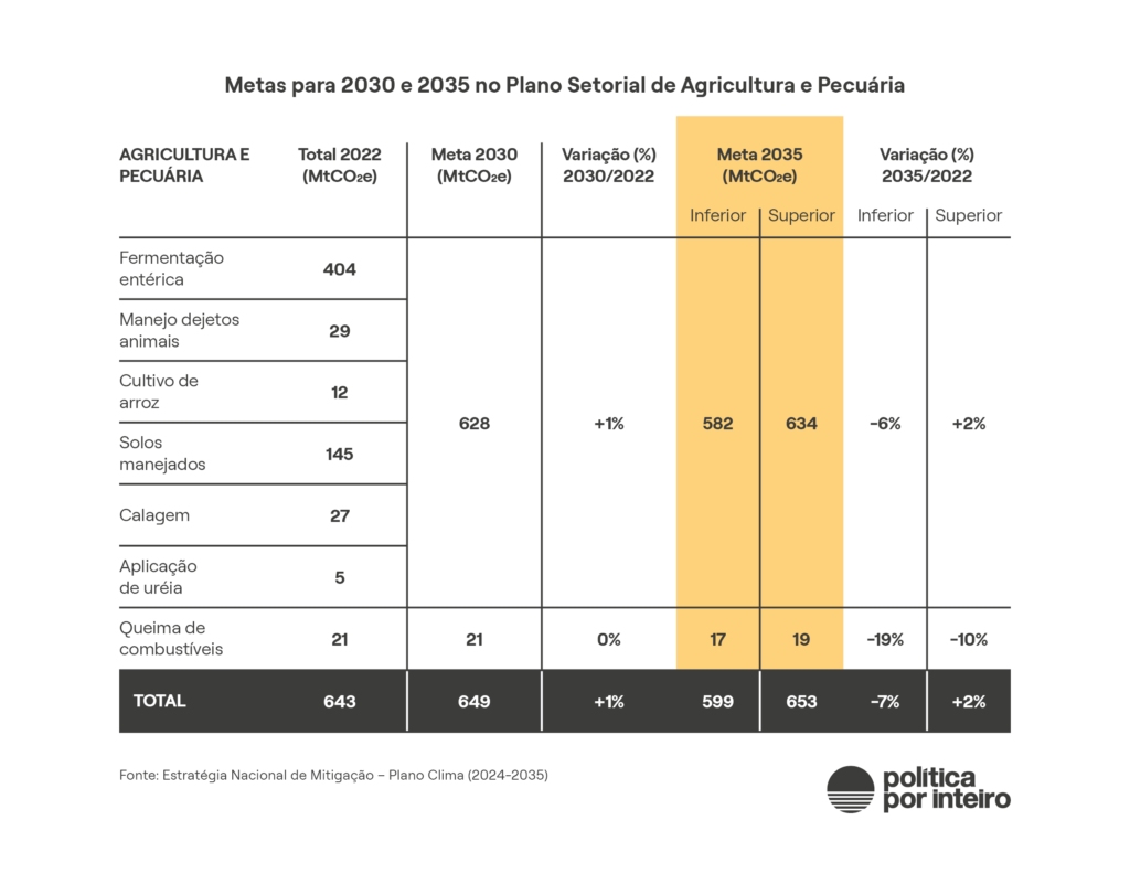 Mas não há, no Plano Clima, medida para enfrentar a maior fonte de emissões do setor, a fermentação entérica, decorrente do processo digestivo do gado, responsável por 65% dos gases de efeito estufa do setor e quase a quinta parte (20%) das emissões totais do Brasil, de acordo com dados do inventário nacional usados na Estratégia Nacional de Mitigação.