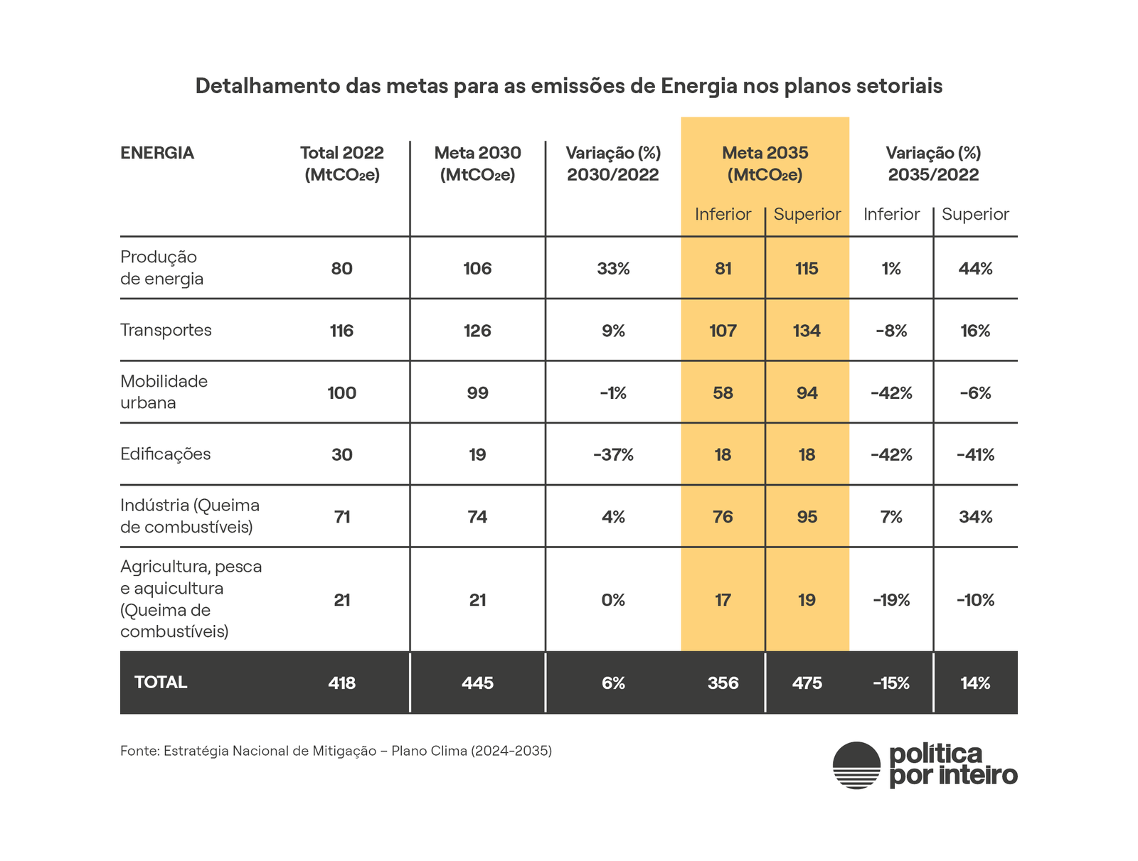 As ações do Plano Clima, no entanto, pelo menos até 2035, projetam aumento nas emissões tanto na produção de energia, como na indústria e no setor de transportes, onde há uso de combustíveis fósseis, como mostra a tabela 2.