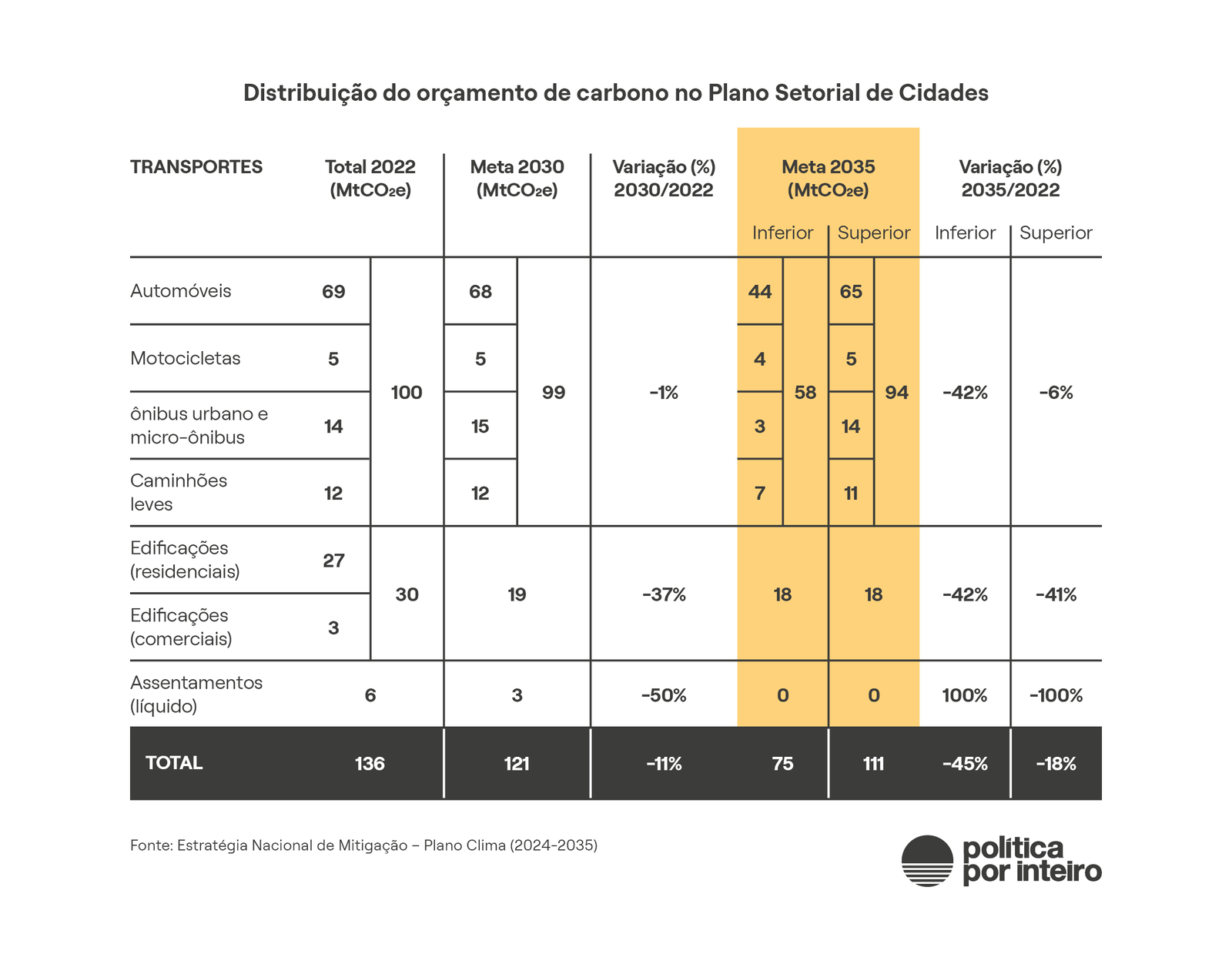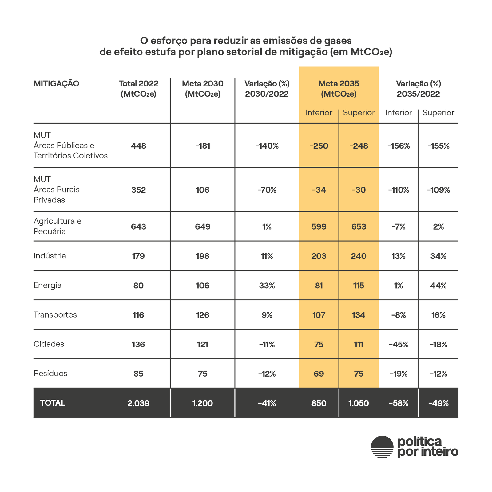 Para efeito de elaboração dos planos setorPara efeito de elaboração dos planos setoriais de mitigação, o Plano Clima realocou emissões dos cinco setores do inventário nacional em oito planos. O esforço de cada um pode ser visto na tabela 2. No conjunto, esses planos setoriais aterrizam o compromisso brasileiro na Convenção do Clima e representam uma redução entre 49% e 58% em relação às emissões de gases de efeito estufa registradas em 2022.