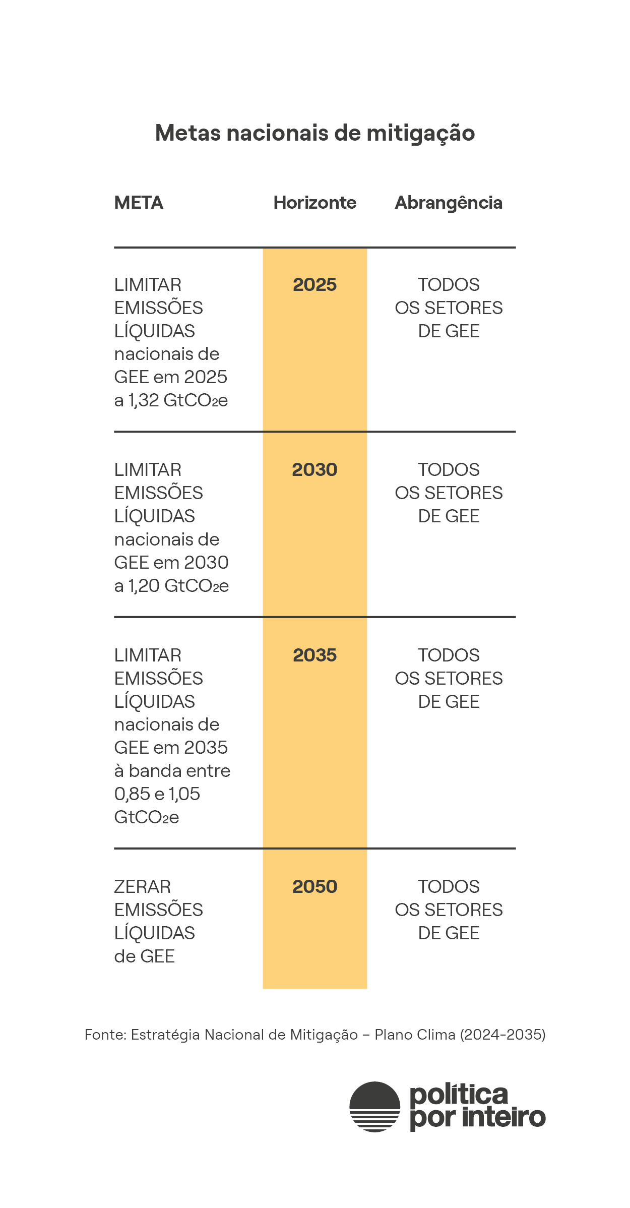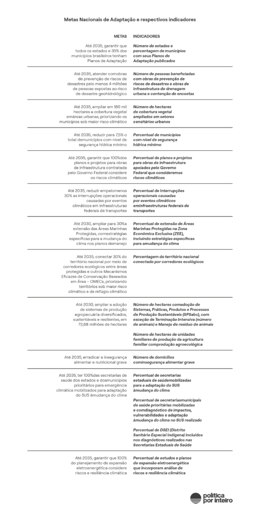 O horizonte do Plano Clima é 2035, terceira escala no compromisso climático brasileiro, antes de alcançar emissões líquidas zero em 2050.