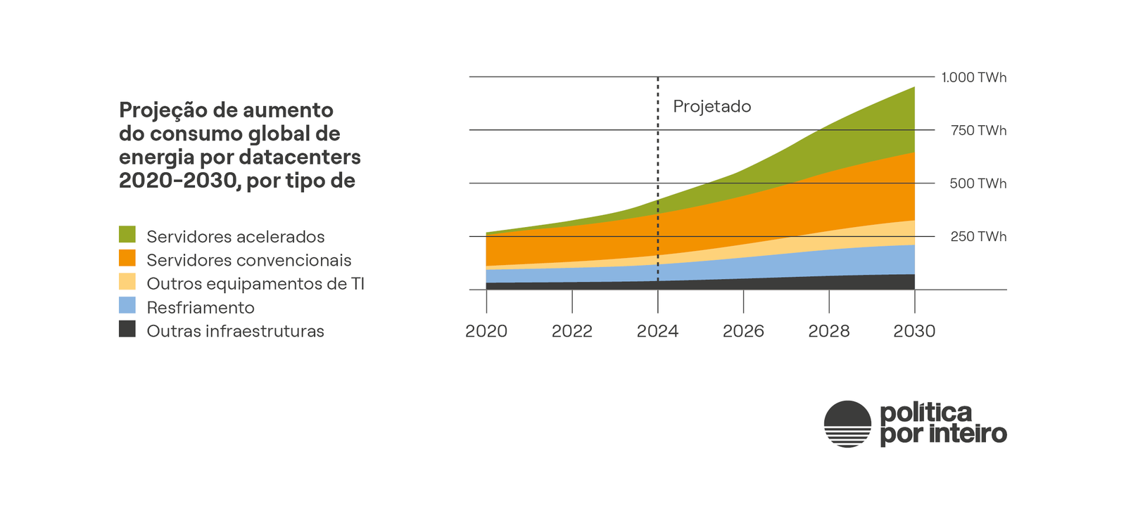 O consumo gigante de energia por data centers cria uma preocupação extra para a agenda climática. Estudo da Agência Internacional de Energia (IEA, na sigla em inglês)(29) revela que o consumo de energia elétrica no mundo por conta dos data centers irá dobrar até 2030, com essas instalações consumindo quase 3% da demanda global de energia.