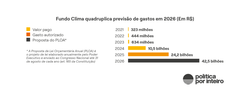 Desde 2024, o Fundo Clima vem contando com volumes crescentes de dinheiro do Orçamento da União, sobretudo a partir da emissão de títulos verdes no mercado internacional (três emissões até aqui) e, a partir de 2026, com a destinação de recursos do petróleo (73% da previsão de gastos do Fundo, segundo o Projeto de Lei Orçamentária Anual enviado ao Congresso).