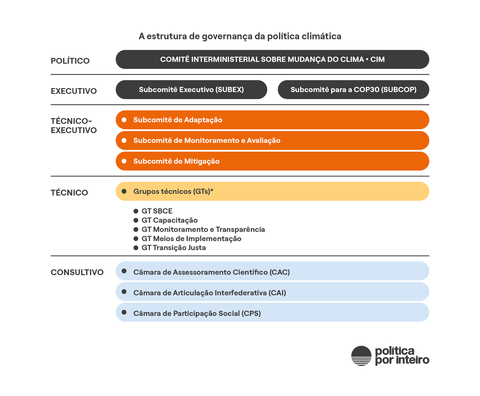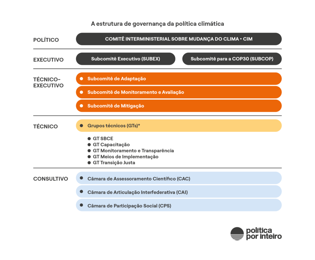 Já no nível técnico, há oito grupos de trabalho. Esses GTs elaboraram tanto as estratégias nacionais e os planos setoriais de mitigação e adaptação, assim como a regulamentação do Sistema Brasileiro do Comércio de Emissões (SBCE) e a revisão da Política Nacional sobre Mudança do Clima (PNMC).
