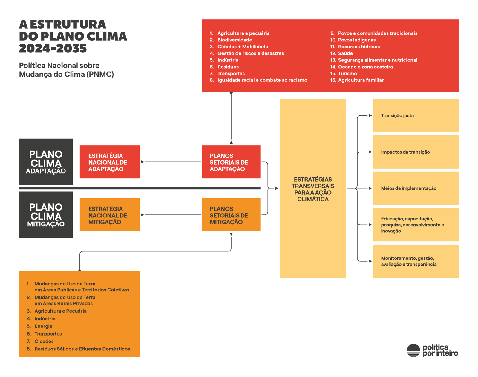Sem considerar oficialmente perdida a meta de 2025, o Plano Clima trabalha nas metas para 2030 e 2035. Submetido a consultas públicas a partir do final de 2024, o plano é composto de estratégias nacionais de mitigação e adaptação, 8 planos setoriais de mitigação, 16 planos setoriais de adaptação e mais cinco estratégias transversais, ainda em desenvolvimento no momento de elaboração deste relatório.